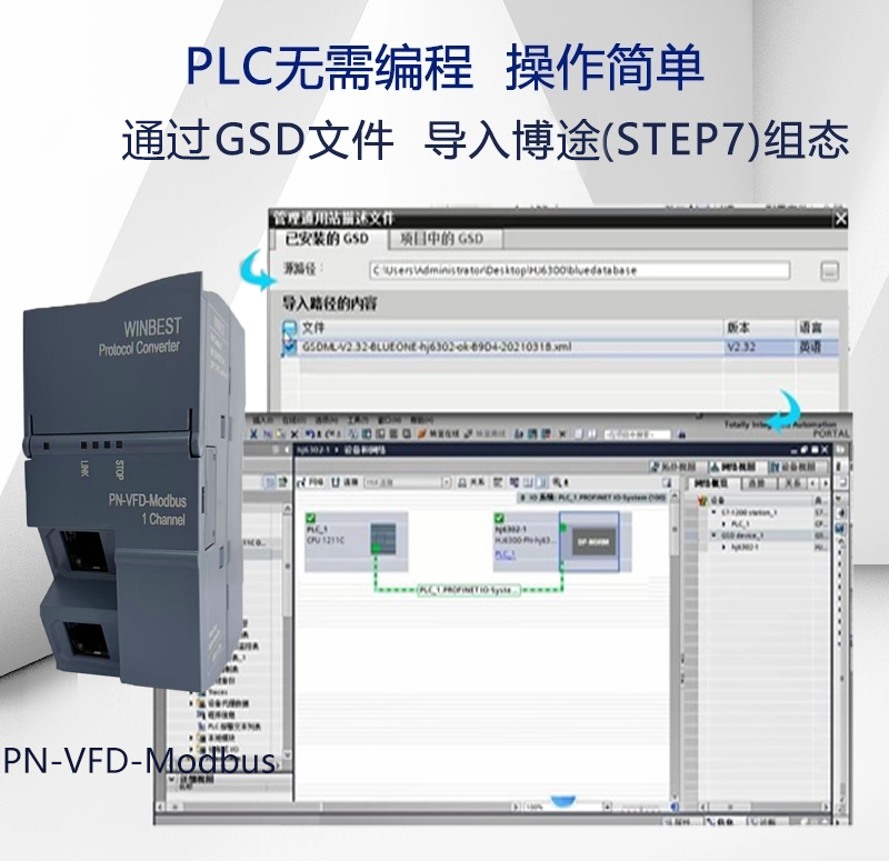 通过对应指定型号变频器GSD文件导入到博途或者 S7 编程软件,无需编程,自动生成 I 地址和 Q 地址。
